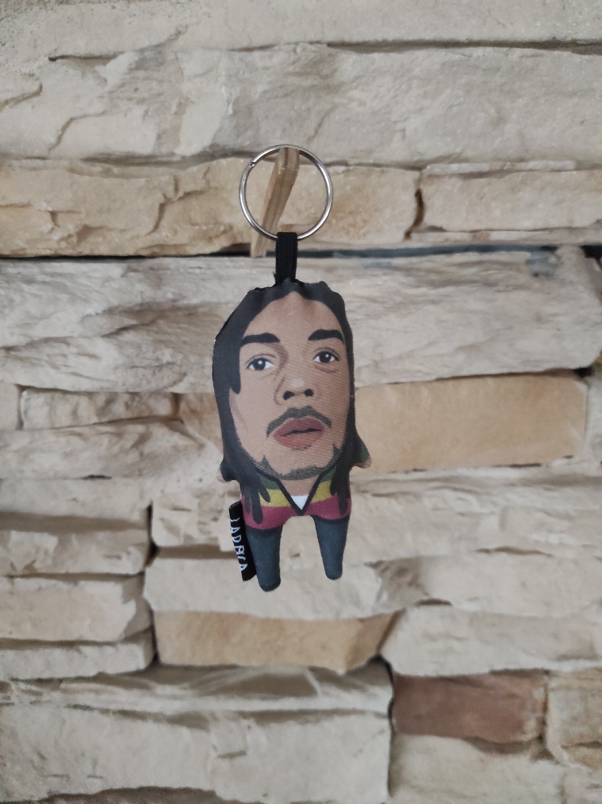 Porta chaves estampado em tecido com ilustrações baseadas em ícones.